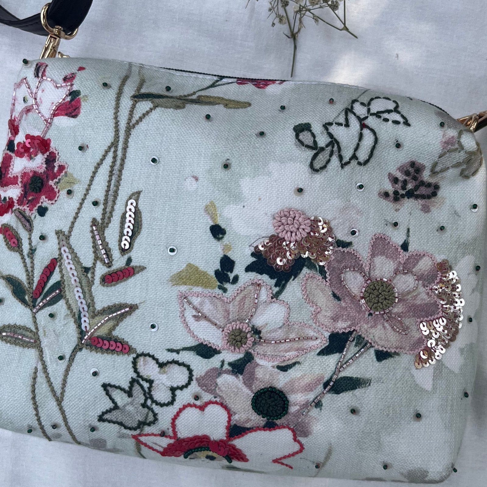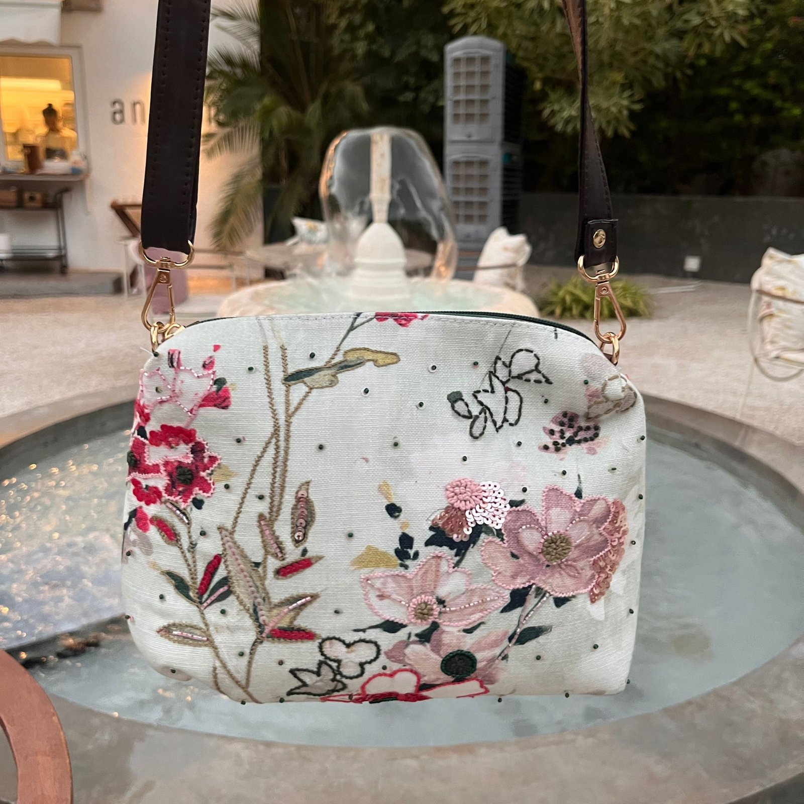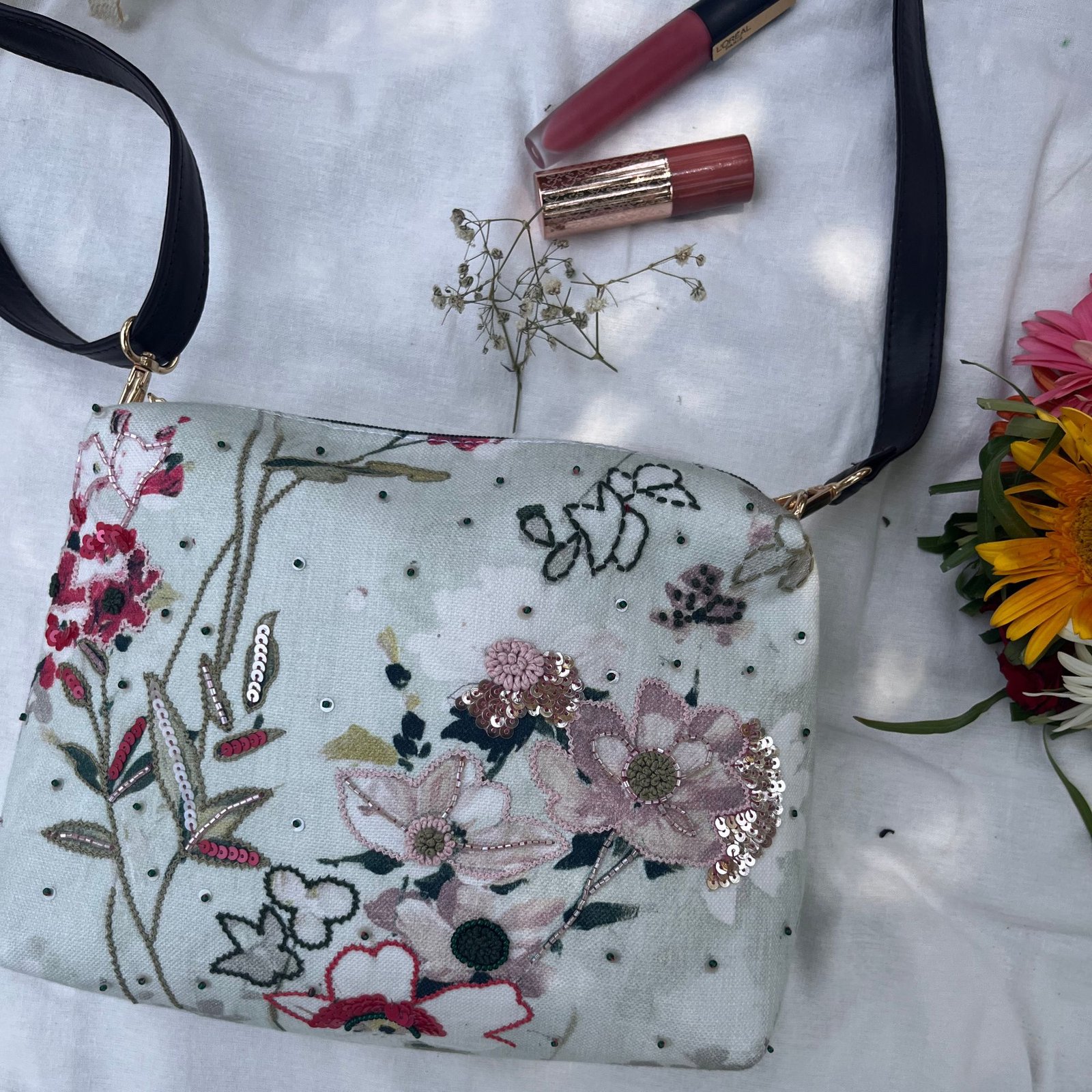 This Ayezaan Sling Bag is a delicate blend of artistry and femininity, crafted on soft cotton printed fabric with textured threadwork, fine sequins and subtle embellishments that add gentle sparkle. Designed for comfort and versatility, it features a detachable sling strap and a compact yet spacious interior to carry your daily essentials with ease. Perfect for casual outings, brunches, travel pouch and due to it’s subtle scattered embellishments it can also become the perfect accessory for the festive moments