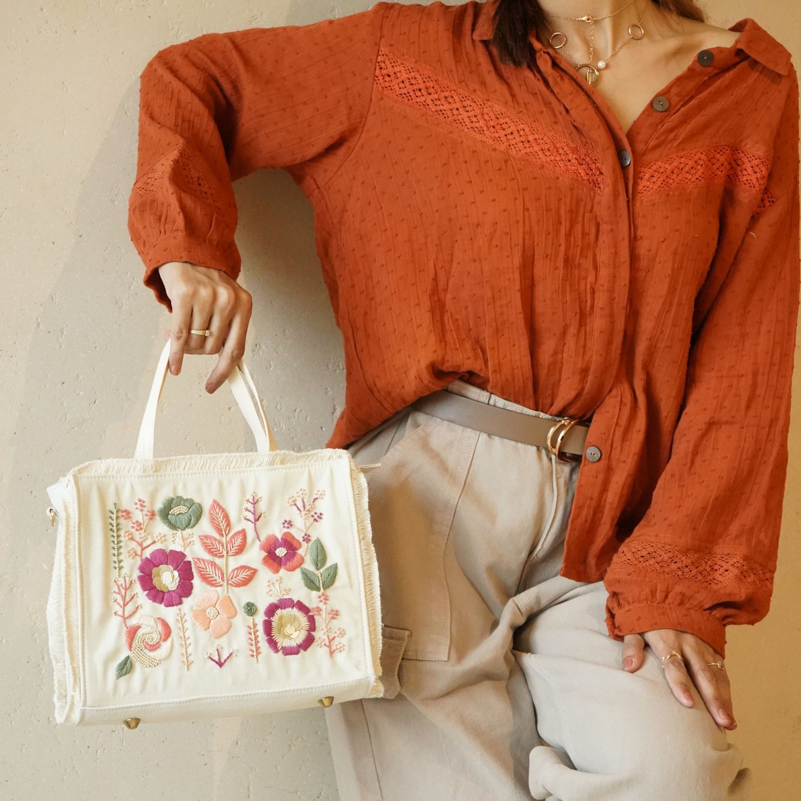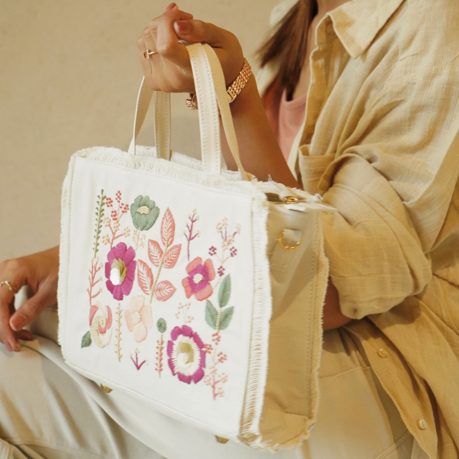 The Bloom Companion Bag blends refined structure with handcrafted charm. Crafted in a soft beige fabric, it features lively floral embroidery that adds a graceful pop of colour while maintaining a clean, sophisticated look.