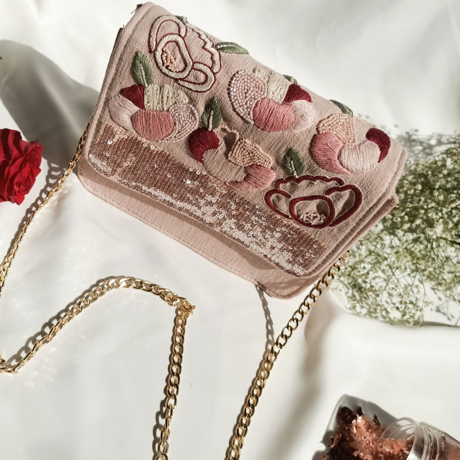 Blush Pink Sling Bag is a handcrafted statement sling featuring rose Inspired floral detailing, perfect as evening bag and parties.