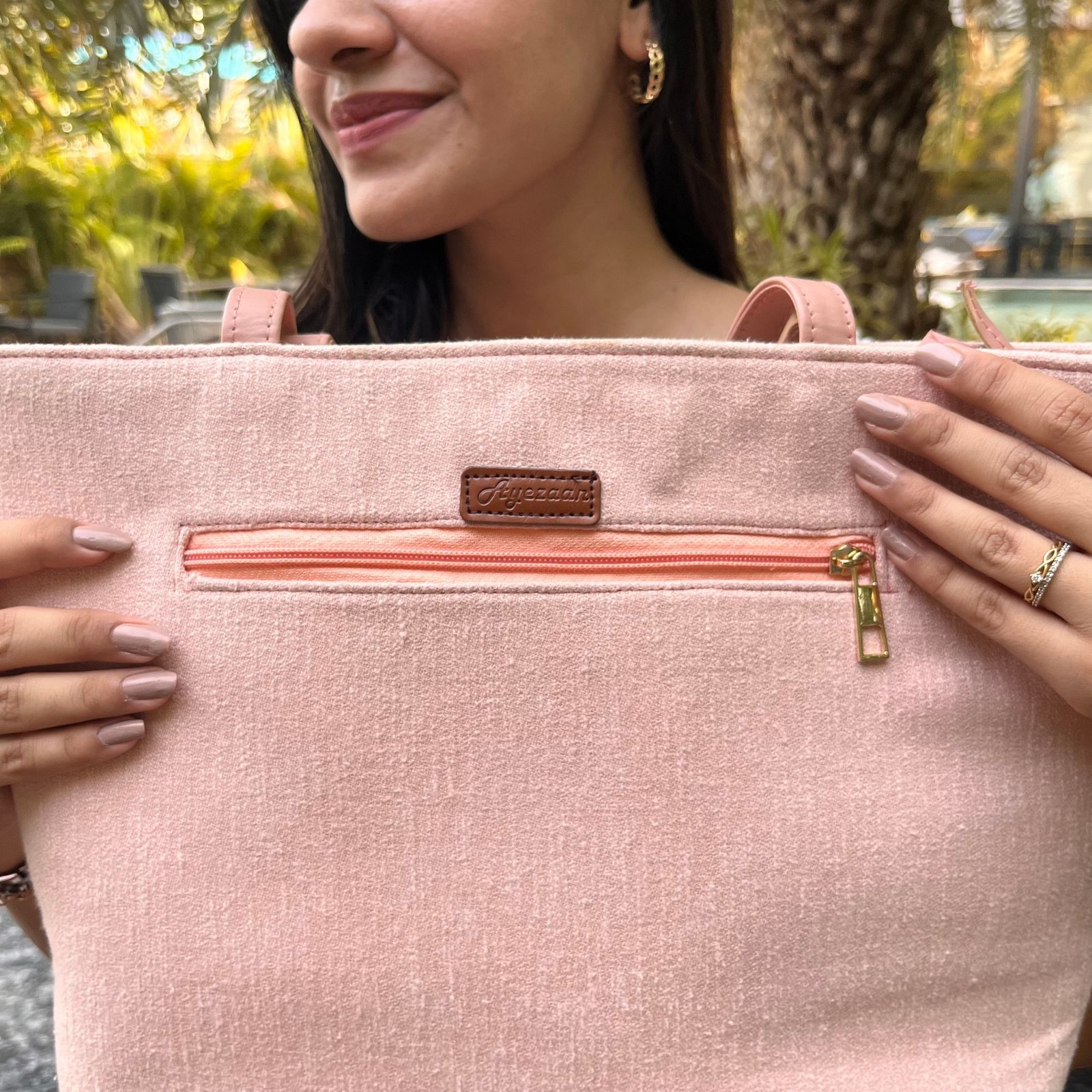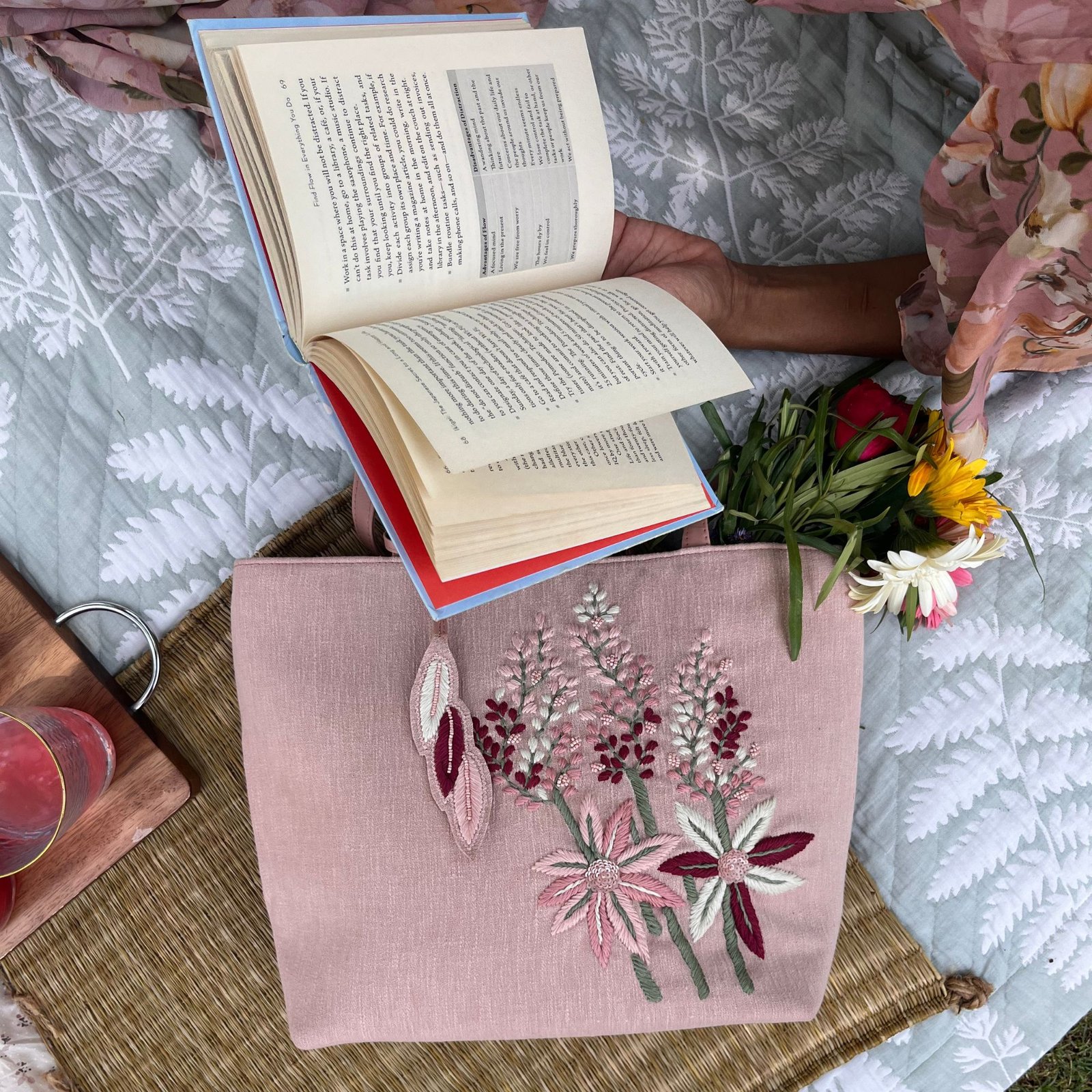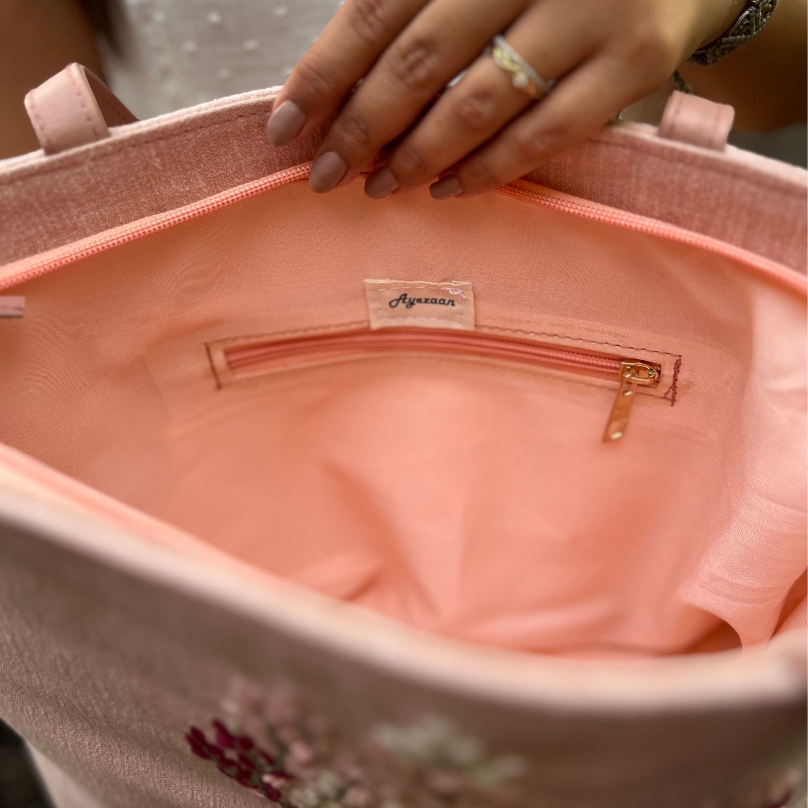 Blush Pink Tote Bag is a handcrafted embroidered tote featuring delicate floral detailing on premium fabric. Spacious, elegant, and perfect for everyday use, outings, and gifting.