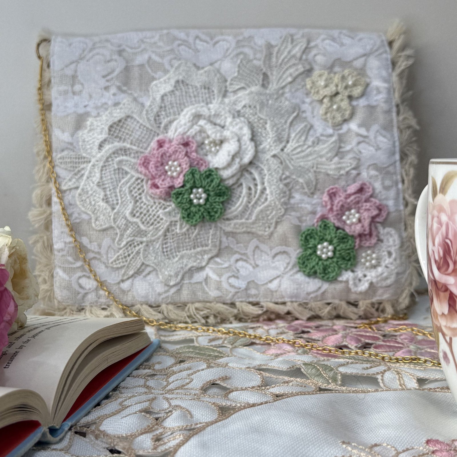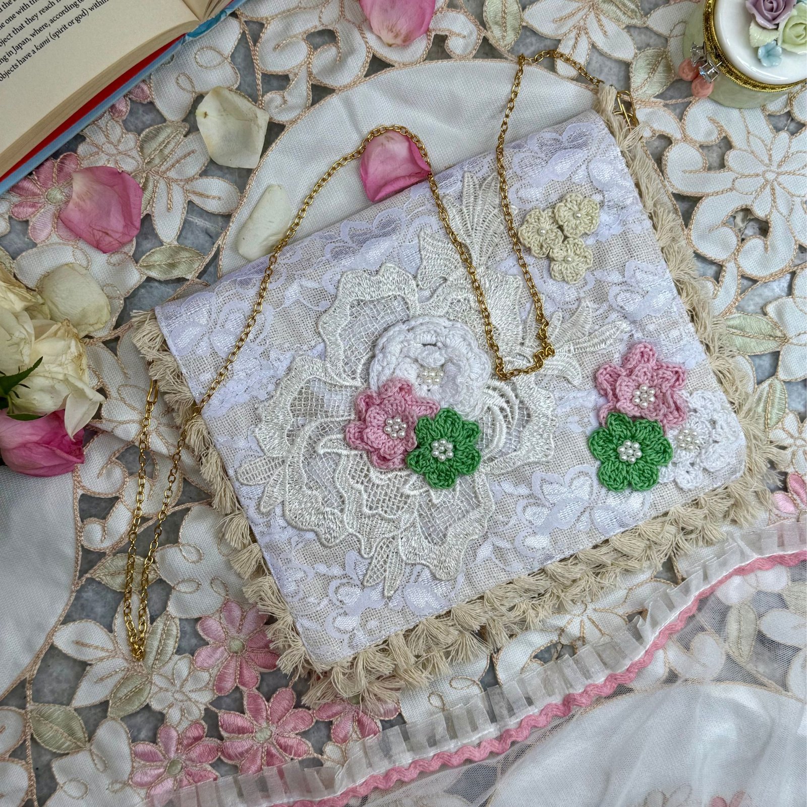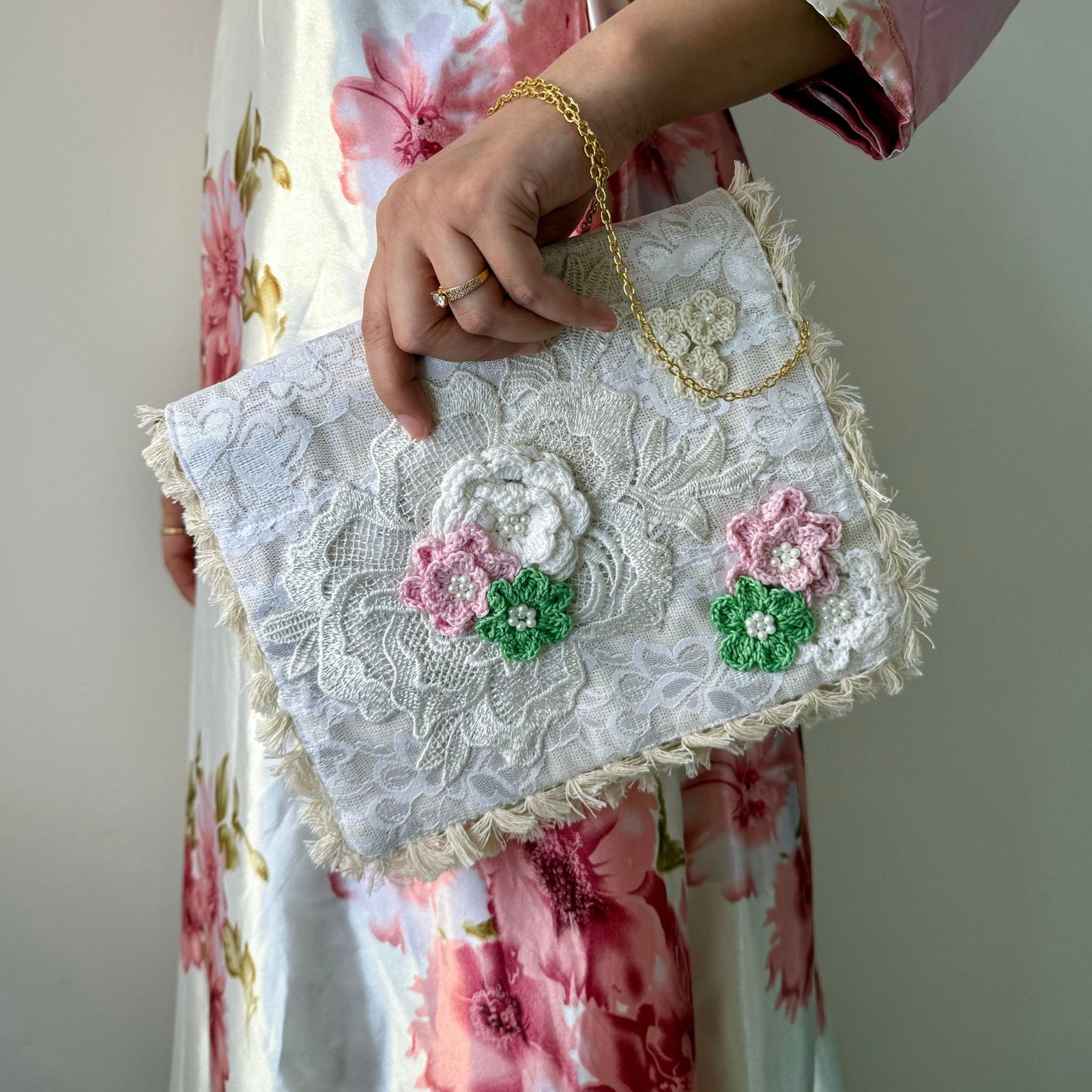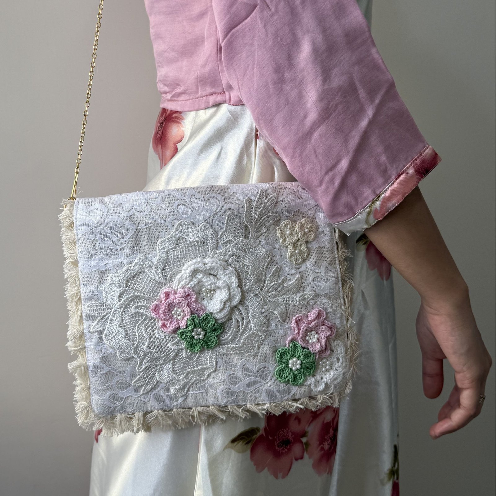 The Moonlace Envelope Sling Bag is a refined blend of elegance and modern charm. Designed in a classic envelope shape, this handcrafted bag features intricate lace embroidery with floral detailing, giving it a soft yet premium appeal.