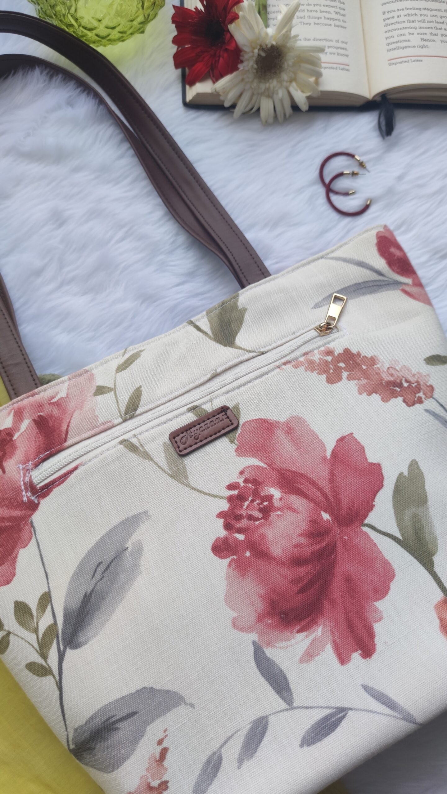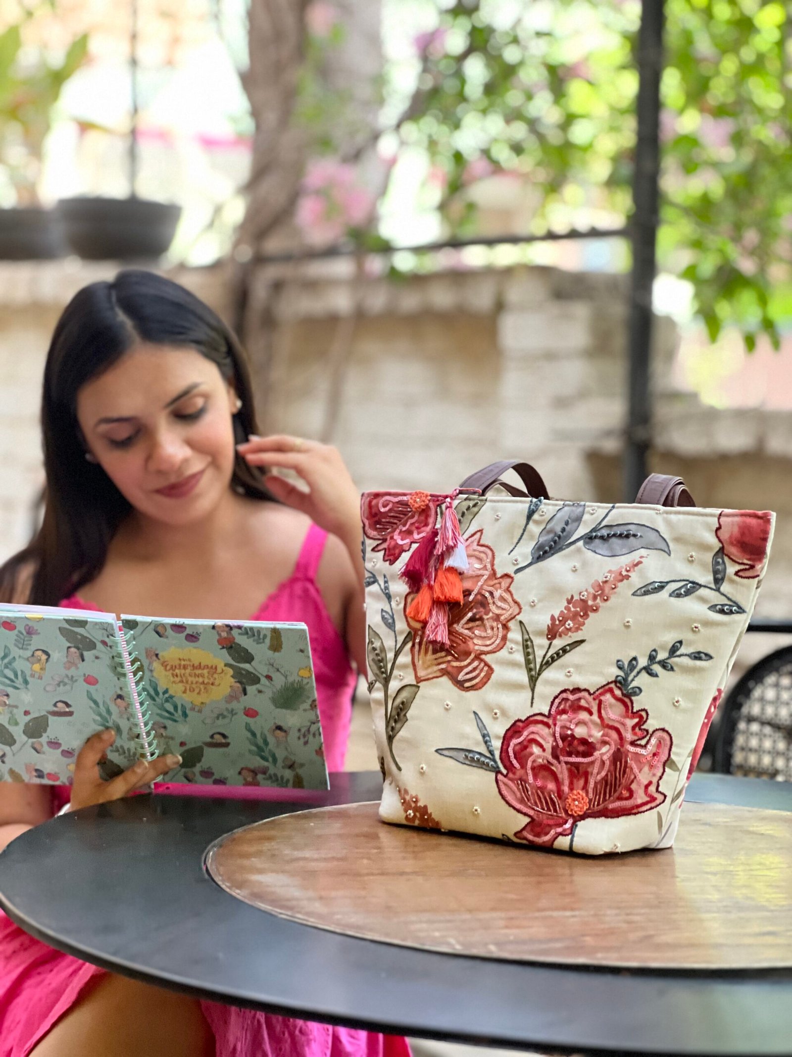 A floral cotton tote with printed blooms and delicate hand embroidery.Spacious, lightweight, and easy to carry, it’s perfect for everyday use and special occasions.