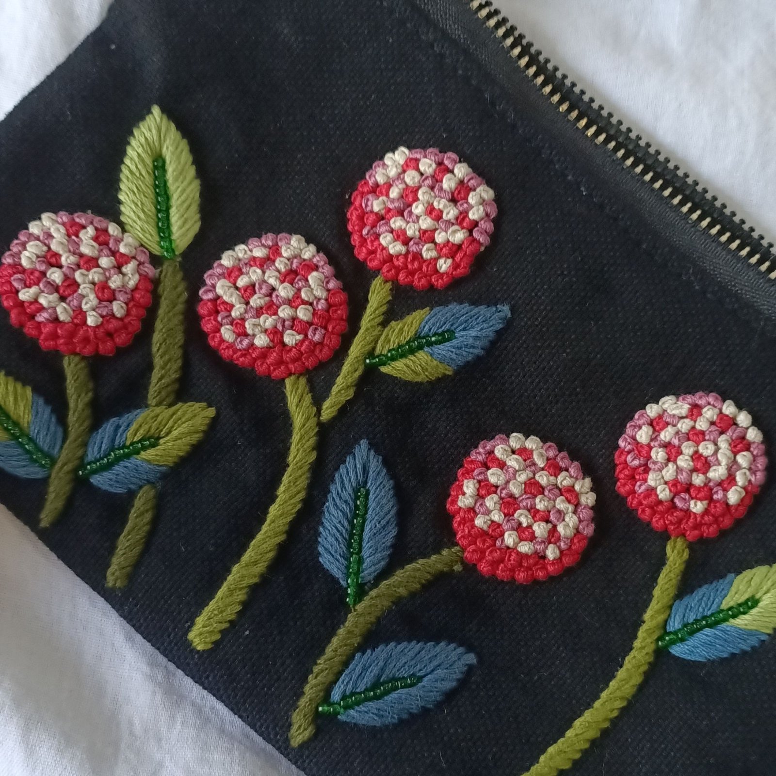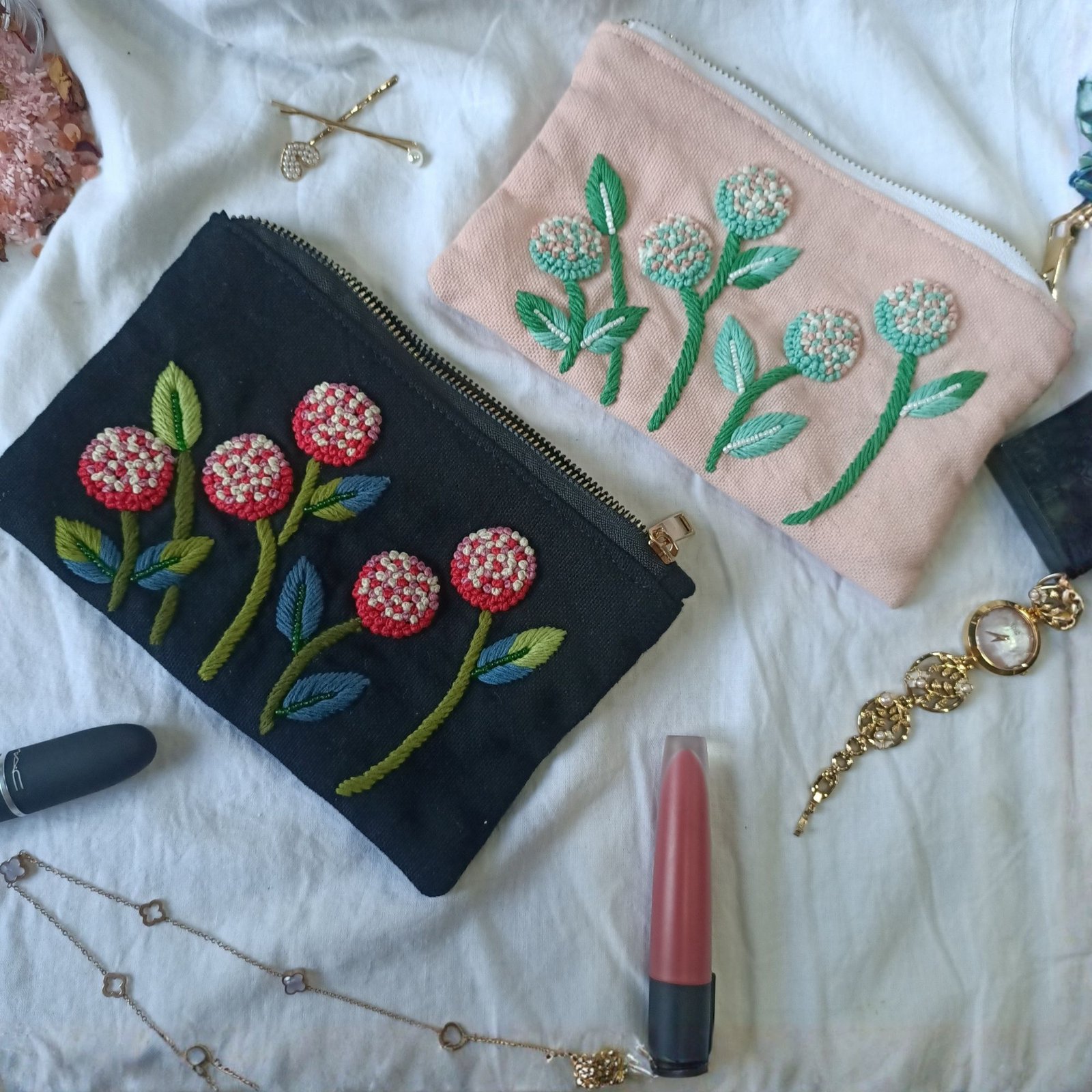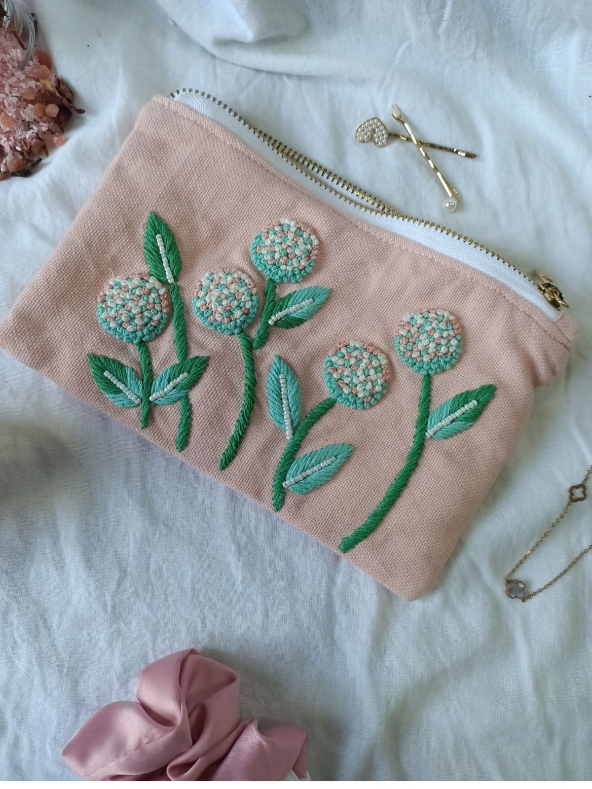 Thoughtfully handcrafted with intricate French knot embroidery, this Small Essential Pouch is all about fine detailing and premium finishing. The texture and neatness of the knot work makes it truly stand out a finishing that feels luxe and worth admiring.