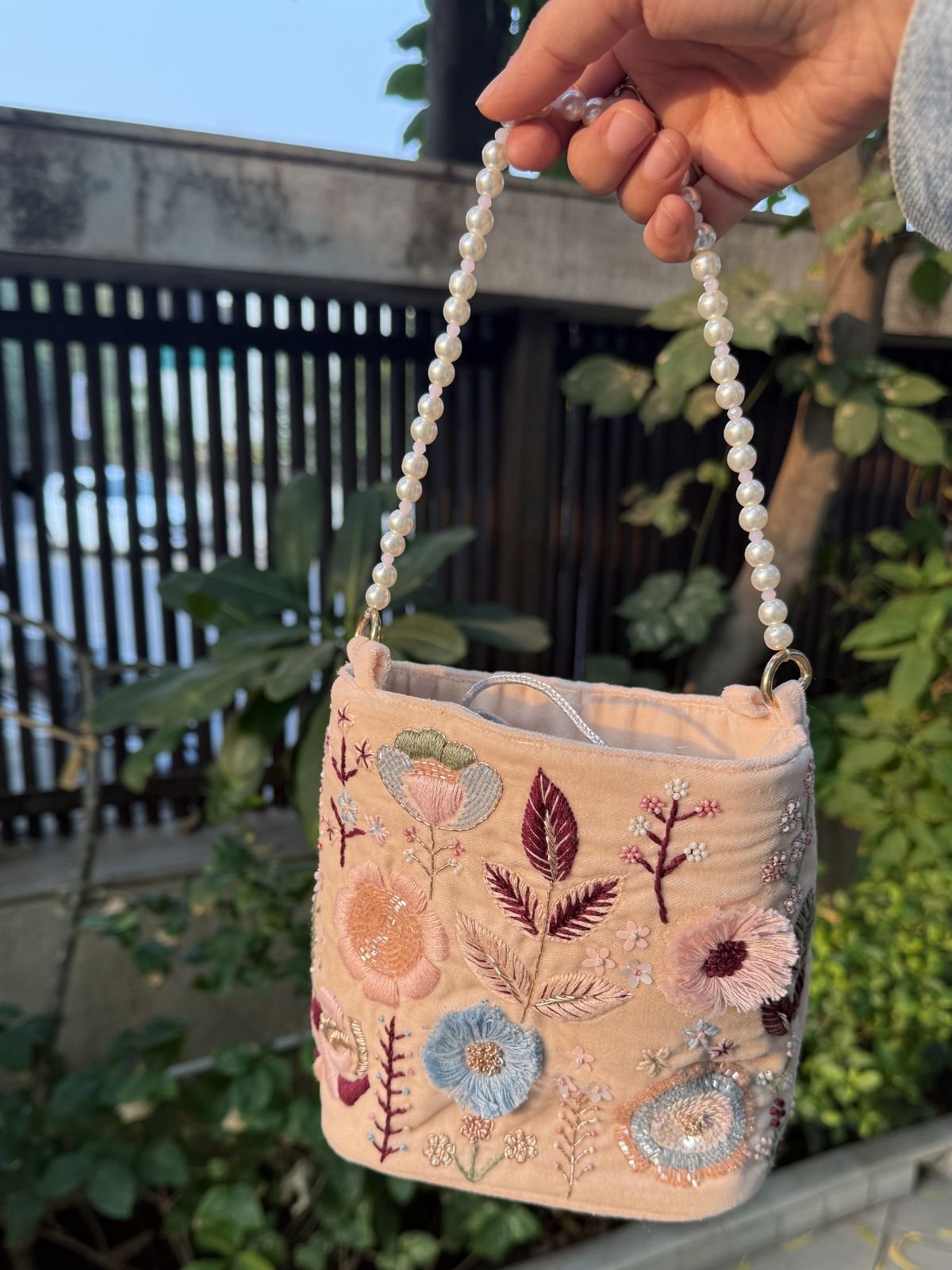 Delicate, dreamy, and handcrafted to perfection — the Soft Pink Velvet Potli is designed to add a luxurious touch to your festive and bridal looks. Crafted in rich pastel pink velvet, this bucket-style potli features intricate 3D hand embroidery with floral and leafy motifs,brought to life with fine threadwork elevated further with zardozi highlights, adding just the right amount of shimmer and festive glam, making it perfect for bridal occasions and celebrations.