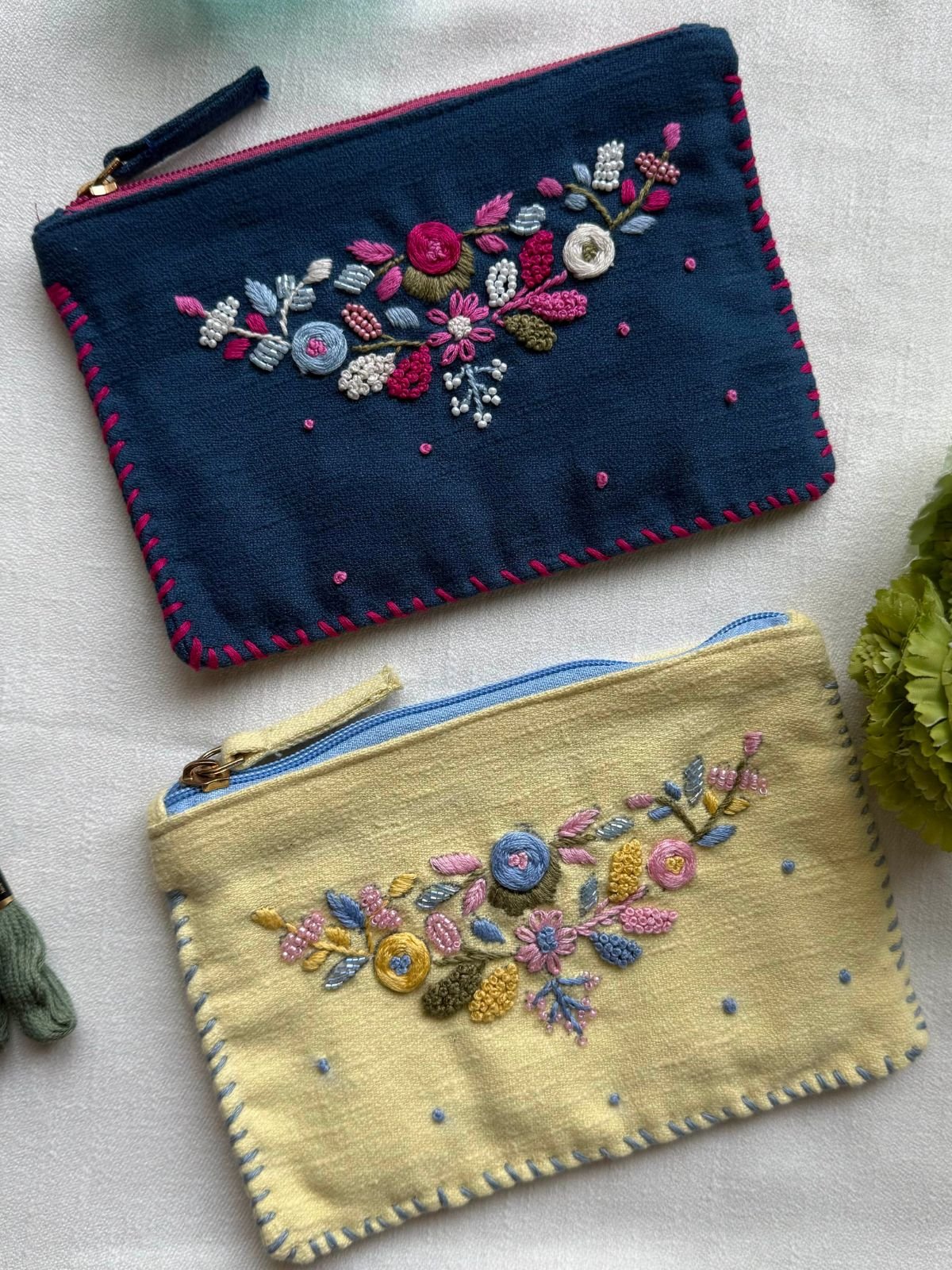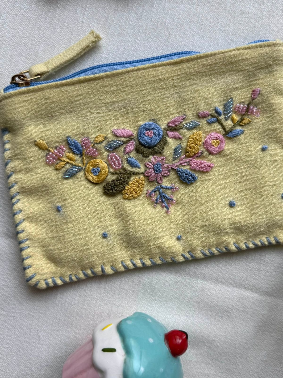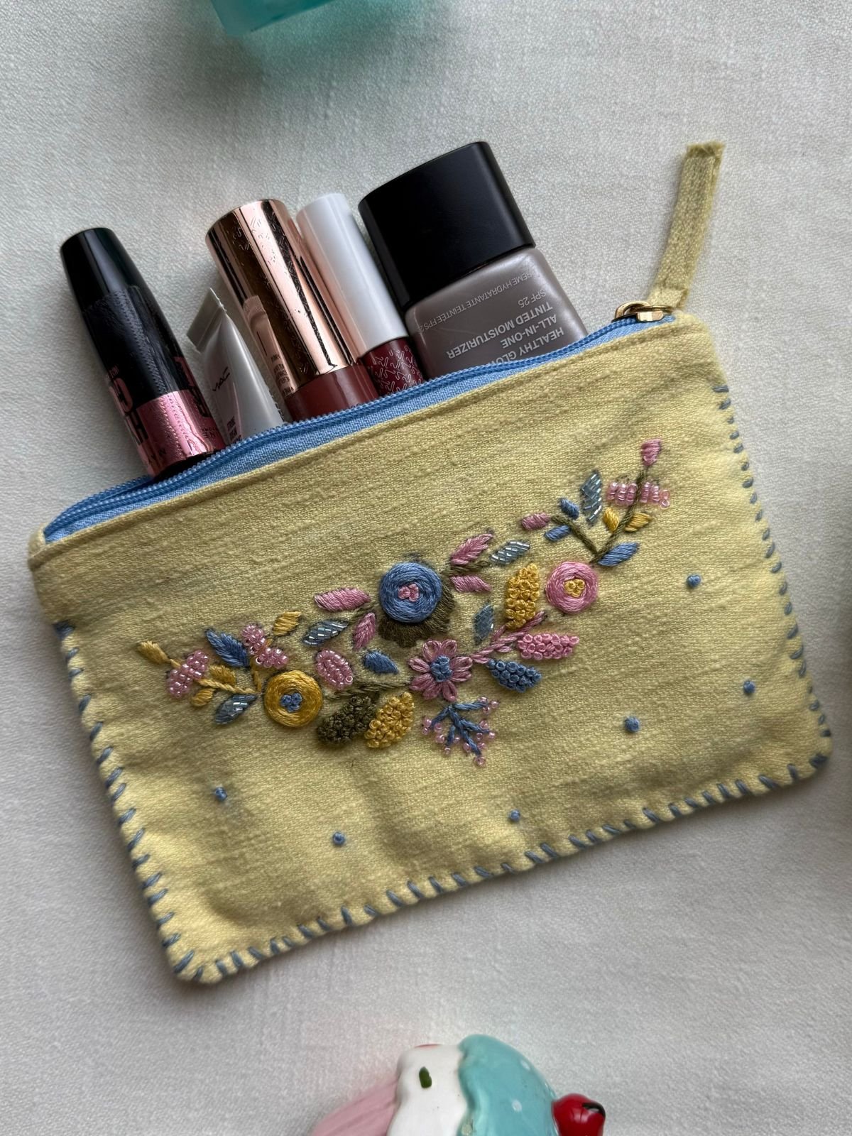 Pastel Yellow Sunshine is a handcrafted embroidered pouch designed to keep your small essentials organized in the most elegant way. Made in a soft, subtle yellow that instantly lifts any look, this shade is fresh, flattering, and impossible to ignore. Featuring a beautiful rose motif with intricate threadwork and delicate bead detailing, it’s finished with refined hand-stitched edges for an elevated touch. Compact yet spacious, it fits perfectly inside tote bags and handbags ideal for daily use, travel, or gifting.